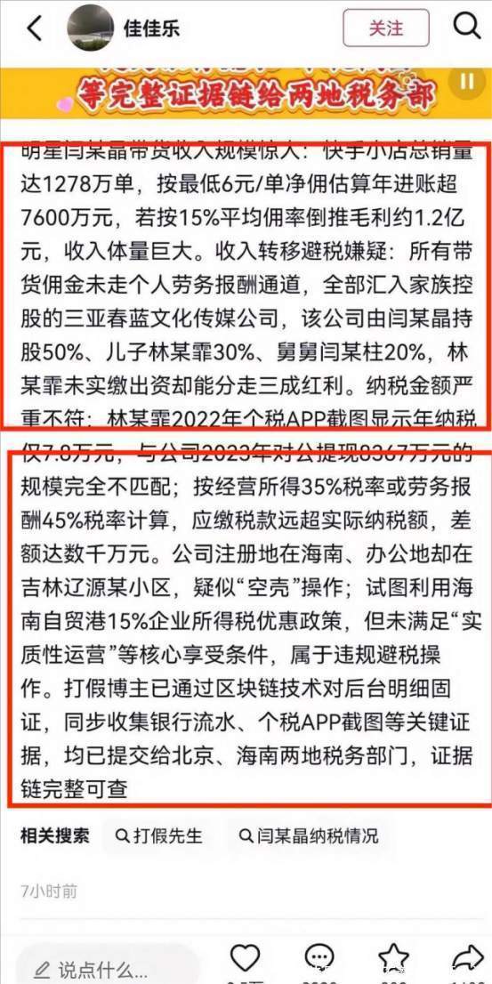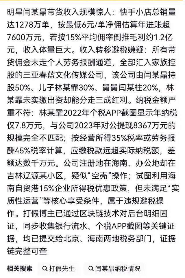 如果说前面的争议都是开胃小菜,那接下来的偷税举报,就是真正的致命大菜。这次的举报来自一位长期活跃在网络上的打假博主,他没有纠结于闫学晶的私生活,而是直接瞄准了最硬核的问题:她的钱从哪来,有没有依法交税?